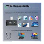 میکروفون بویا Omic-U تایپ سیدر دنیای پرهیاهوی امروز، صدای شفاف و رسا اهمیتی حیاتی دارد. چه یک ولاگر پرشور باشید که تجربیات سفر خود را به اشتراک میگذارد یا یک پادکستر حرفهای که داستانهای جذاب تعریف میکند، کیفیت صدا میتواند تفاوت بین موفقیت و شکست را رقم بزند. میکروفون بی سیم تایپ سی BOYA OMIC U پاسخی هوشمندانه به این نیاز است. این دستگاه کوچک اما قدرتمند، ترکیبی از تکنولوژی پیشرفته و طراحی کاربرپسند را ارائه میدهد. با قابلیتهای منحصر به فرد خود، OMIC U نه تنها صدای شما را با وضوح خیرهکننده منتقل میکند، بلکه آزادی حرکت بینظیری را نیز فراهم میکند.اتصال بیسیم با فناوری 2.4 گیگاهرتز: این میکروفون یقه ای از فناوری انتقال بیسیم با فرکانس دیجیتال 2.4 گیگاهرتز استفاده میکند که امکان ارتباط قوی و پایدار را تا فاصله 50 متر بدون مانع فراهم میکند. این ویژگی آزادی عمل قابل توجهی به کاربران میدهد تا بدون محدودیت سیم، در محیط حرکت کنند. فناوری 2.4 گیگاهرتز نه تنها اتصال پایداری را تضمین میکند، بلکه با تداخل کمتر با سایر دستگاههای بیسیم، کیفیت صدای بهتری را ارائه میدهد.کیفیت صدای حرفهای: با فرکانس پاسخگویی 20 هرتز تا 20 کیلوهرتز و نسبت سیگنال به نویز (SNR) بیش از 80 دسیبل، کیفیت صدای فوقالعادهای را ارائه میدهد. این مشخصات تضمین میکنند که میکروفون قادر است طیف وسیعی از فرکانسهای صوتی را با وضوح بالا ضبط کند، از باسهای عمیق گرفته تا تنهای بالا. نرخ نمونهبرداری 48 کیلوهرتز و عمق بیت 16 بیتی نیز به این معناست که جزئیات صوتی با دقت بالایی ضبط میشوند.مجهز به یک سیستم کاهش نویز دیجیتال پیشرفته است که کیفیت صدا را در محیطهای پر سروصدا به طور قابل توجهی بهبود میبخشد. این سیستم با استفاده از الگوریتمهای پیچیده، در حالی که صدای اصلی را حفظ میکند، صداهای ناخواسته پسزمینه را شناسایی و فیلتر میکند. این قابلیت به خصوص در محیطهای شلوغ مانند خیابانها، رویدادها یا مکانهای عمومی بسیار مفید است.میکروفون بیسیم تایپ سی BOYA OMIC U طیف گستردهای از کاربردها را پوشش میدهد. در حوزه تولید محتوای دیجیتال، این میکروفون برای ضبط ولاگها، پادکستها و ویدئوهای آموزشی با کیفیت استودیویی ایدهآل است.