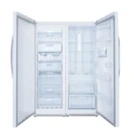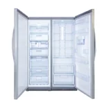 علاوه بر این، در بخش پایین یخچال، 2 کشو قرار دارد که برای نگهداری میوه و سبزیجات طراحی شدهاند و قابلیت حفظ رطوبت را دارند. روشنایی داخل یخچال نیز توسط چراغهای LED در سقف و دیوارههای پشتی تامین میشود. همچنین، یخچال از درب دو لایه برخوردار نیست و به همین دلیل میتواند بر کارایی انرژی تاثیرگذار باشد. از دیگر ویژگیهای این یخچال، میتوان به آب ریز، نمایشگر لمسی و یخ ساز اشاره کرد. نمایشگر لمسی امکان نمایش دما و تنظیمات را فراهم میکند که به کاربر کمک میکند تا دمای مناسب را برای نگهداری مواد غذایی تنظیم کند. همچنین یخ ساز داخلی، امکان تهیه آب یخ را به صورت مداوم فراهم میکند.